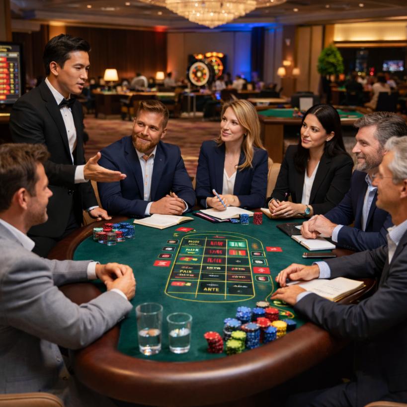 The ultimate on-premises team bonding. Bring your team to our physical location for a live casino-style event designed to foster connection through interactive, face-to-face entertainment.